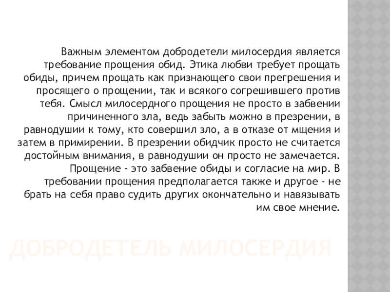 Важным элементом добродетели милосердия является требование прощения обид. Этика любви