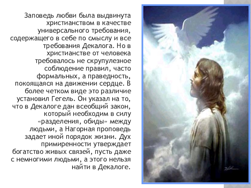 себе по смыслу и все требования Декалога. Но в христианстве от человека требовалось не скрупулезное соблюдение правил, часто формальных, а праведность, покоящаяся на движении сердце. В более четком виде это различие установил Гегель. Он указал на то, что в Декалоге дан всеобщий закон, который необходим в силу «разделения, обиды» между людьми, а Нагорная проповедь задает иной порядок жизни. Дух примиренности утверждает богатство живых связей, пусть даже с немногими людьми, а этого нельзя найти в Декалоге.