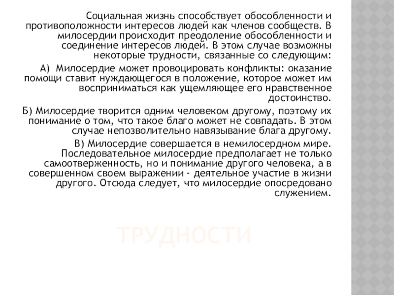 В милосердии происходит преодоление обособленности и соединение интересов людей. В этом случае возможны некоторые трудности, связанные со следующим: