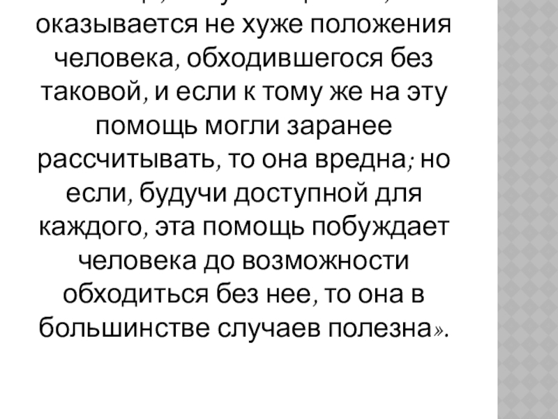 оказывается не хуже положения человека, обходившегося без таковой, и если к тому же на эту помощь могли заранее рассчитывать, то она вредна; но если, будучи доступной для каждого, эта помощь побуждает человека до возможности обходиться без нее, то она в большинстве случаев полезна».