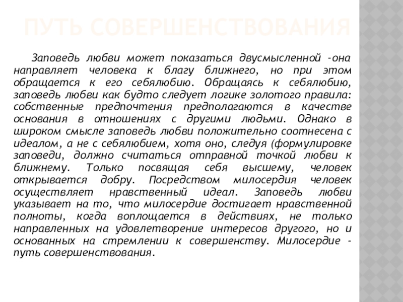 к благу ближнего, но при этом обращается к его себялюбию. Обращаясь к себялюбию, заповедь любви как будто следует логике золотого правила: собственные предпочтения предполагаются в качестве основания в отношениях с другими людьми. Однако в широком смысле заповедь любви положительно соотнесена с идеалом, а не с себялюбием, хотя оно, следуя (формулировке заповеди, должно считаться отправной точкой любви к ближнему. Только посвящая себя высшему, человек открывается добру. Посредством милосердия человек осуществляет нравственный идеал. Заповедь любви указывает на то, что милосердие достигает нравственной полноты, когда воплощается в действиях, не только направленных на удовлетворение интересов другого, но и основанных на стремлении к совершенству. Милосердие - путь совершенствования.