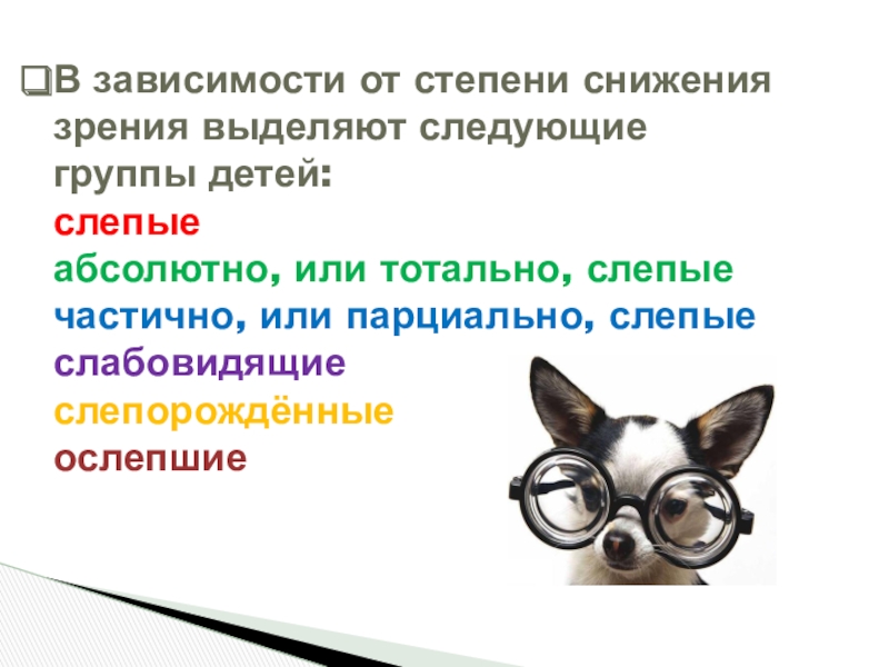 Слайд 10слепые – дети с полным отсутствием зрительных ощущений, либо имеющие остаточное