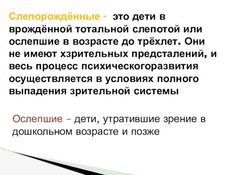 Слайд 13Слепорождённые - это дети в врождённой тотальной слепотой или ослепшие в