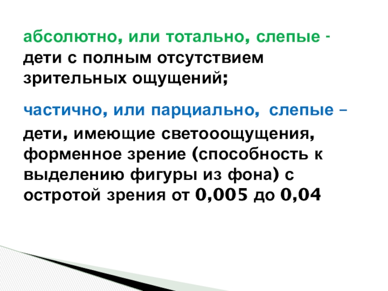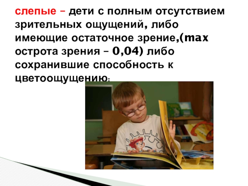 или парциально, слепые – дети, имеющие светооощущения, форменное зрение (способность к выделению фигуры из фона) с остротой зрения от 0,005 до 0,04