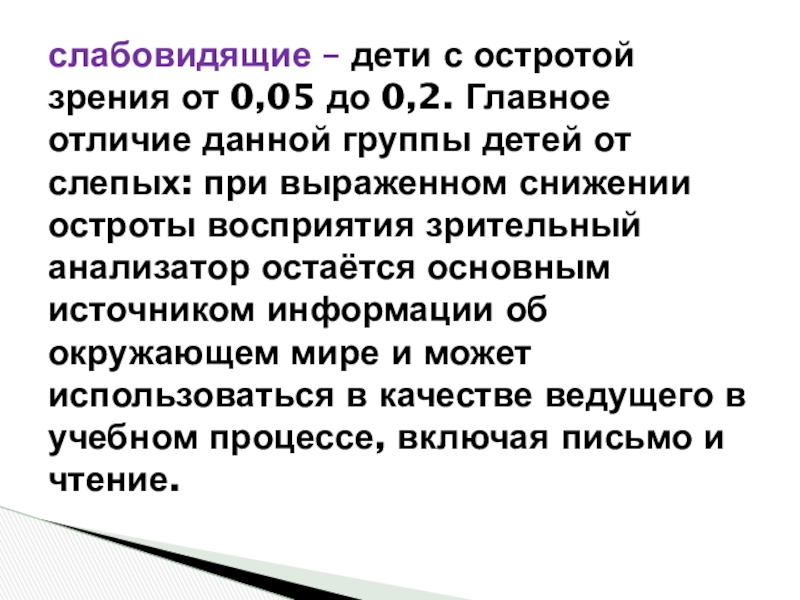 Слайд 12слабовидящие – дети с остротой зрения от 0,05 до 0,2. Главное