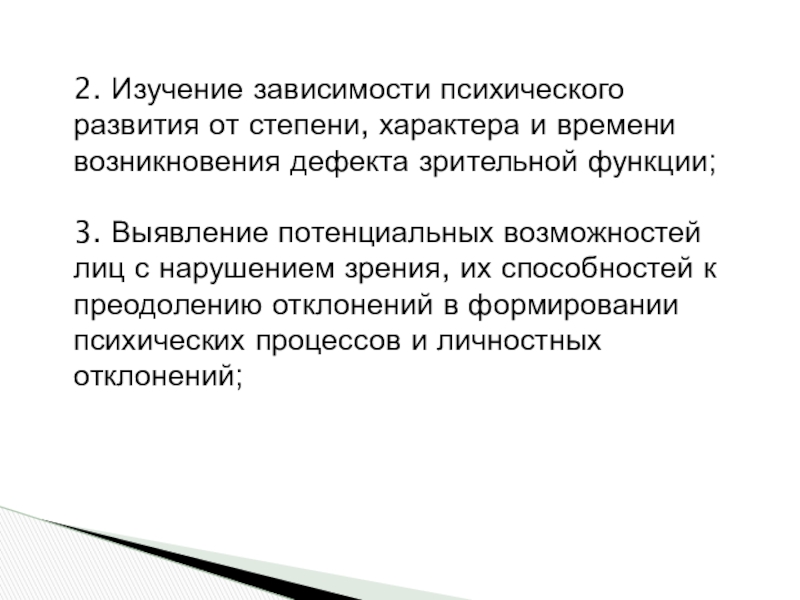 3. Выявление потенциальных возможностей лиц с нарушением зрения, их способностей к преодолению отклонений в формировании психических процессов и личностных отклонений;