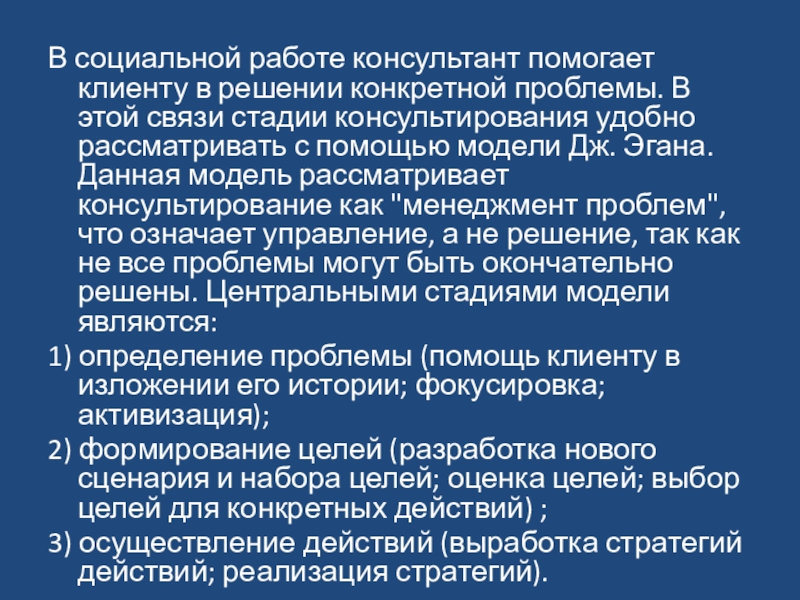 этой связи стадии консультирования удобно рассматривать с помощью модели Дж. Эгана. Данная модель рассматривает консультирование как "менеджмент проблем", что означает управление, а не решение, так как не все проблемы могут быть окончательно решены. Центральными стадиями модели являются: