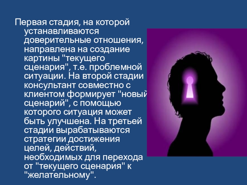"текущего сценария", т.е. проблемной ситуации. На второй стадии консультант совместно с клиентом формирует "новый сценарий", с помощью которого ситуация может быть улучшена. На третьей стадии вырабатываются стратегии достижения целей, действий, необходимых для перехода от "текущего сценария" к "желательному".