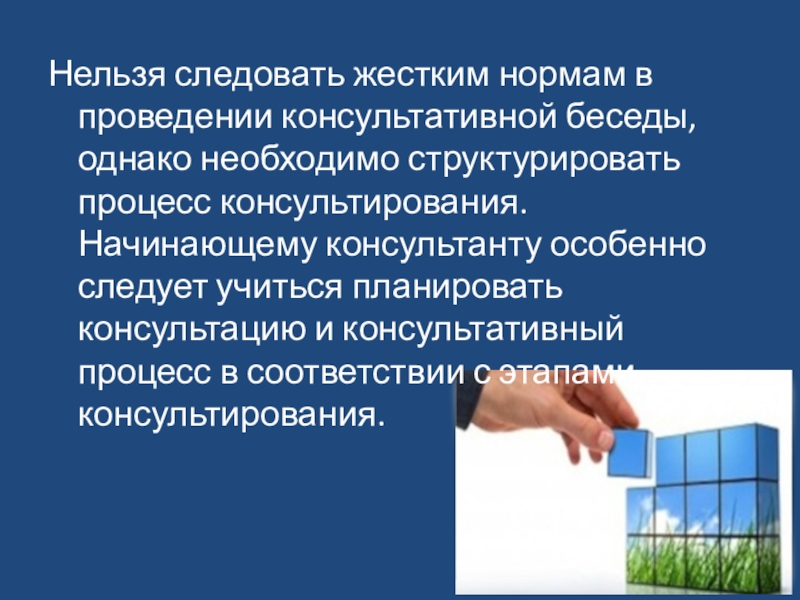 Слайд 19Нельзя следовать жестким нормам в проведении консультативной беседы, однако необходимо структурировать