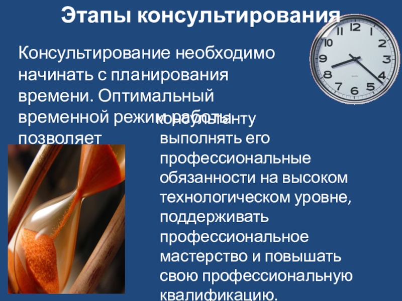Консультирование необходимо начинать с планирования времени. Оптимальный временной режим работы позволяет