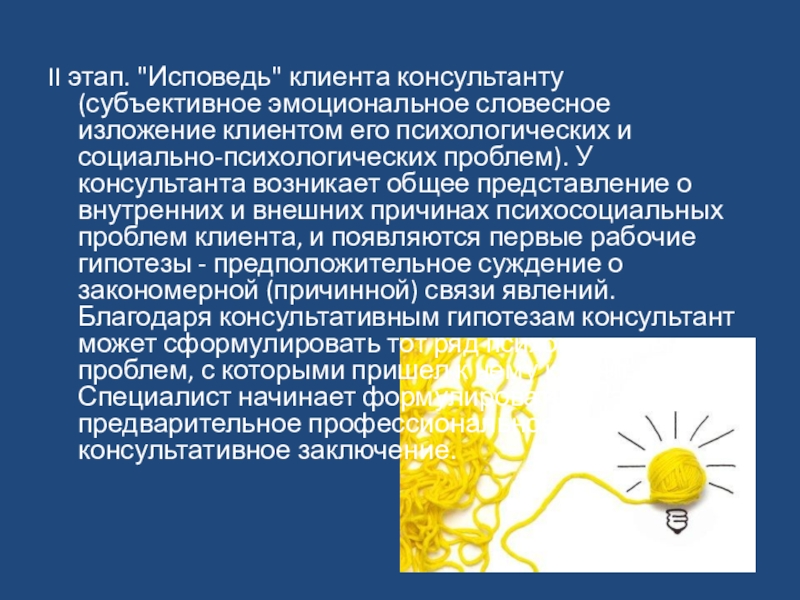 Слайд 13II этап. "Исповедь" клиента консультанту (субъективное эмоциональное словесное изложение клиентом его