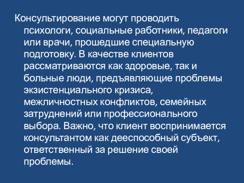 подготовку. В качестве клиентов рассматриваются как здоровые, так и больные люди, предъявляющие проблемы экзистенциального кризиса, межличностных конфликтов, семейных затруднений или профессионального выбора. Важно, что клиент воспринимается консультантом как дееспособный субъект, ответственный за решение своей проблемы.