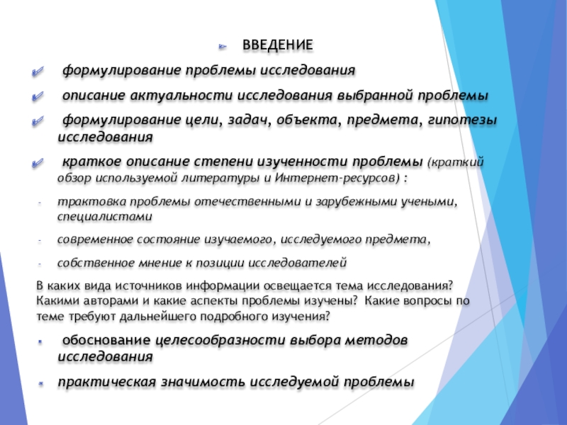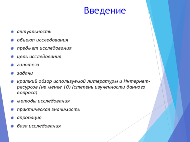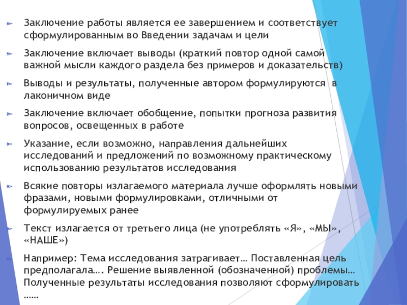 Например: Тема исследования затрагивает… Поставленная цель предполагала…. Решение выявленной (обозначенной) проблемы… Полученные результаты исследования позволяют сформулировать ……