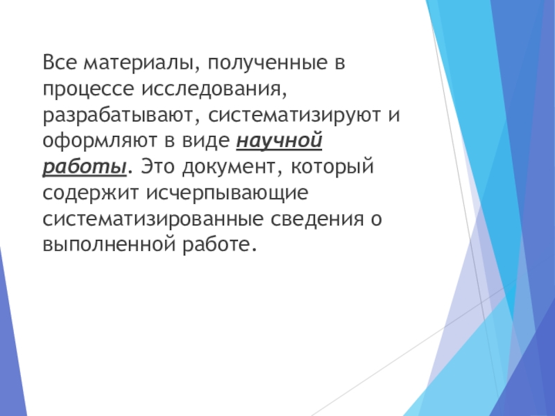 Слайд 2Все материалы, полученные в процессе исследования, разрабатывают, систематизируют и оформляют в
