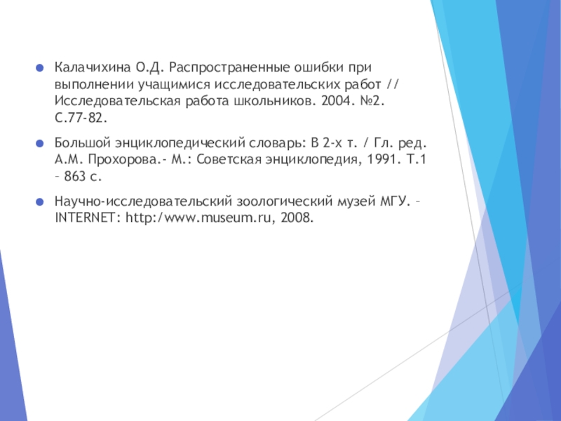 Слайд 14Калачихина О.Д. Распространенные ошибки при выполнении учащимися исследовательских работ // Исследовательская