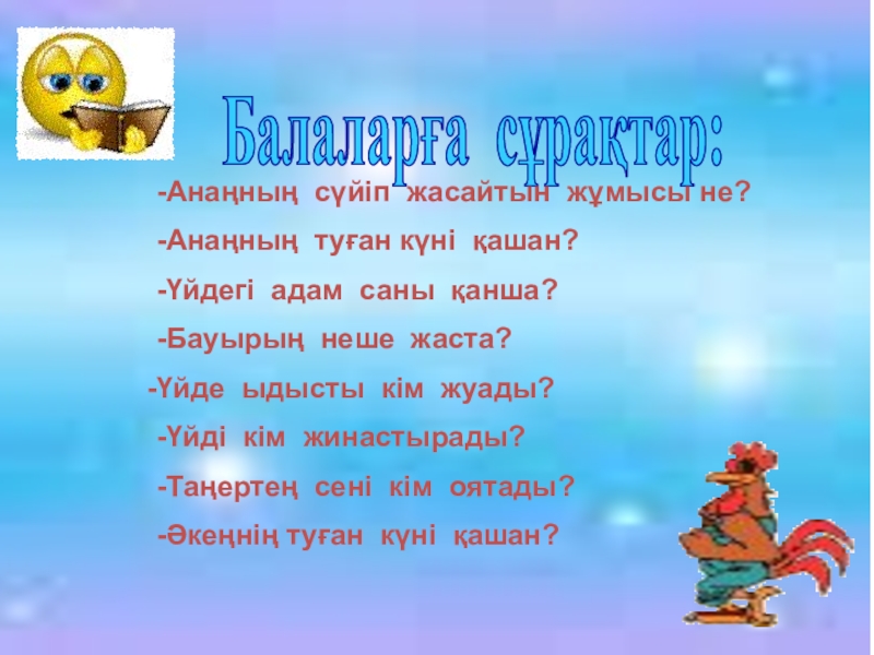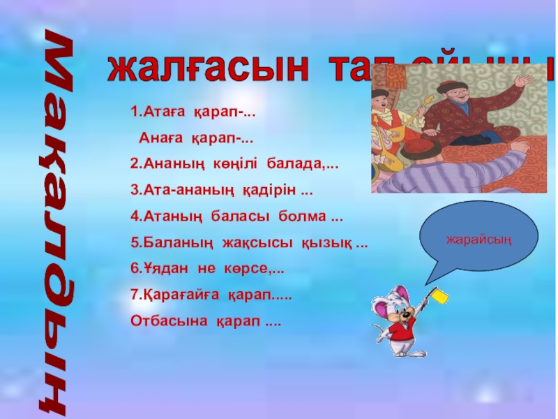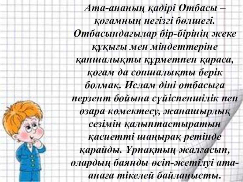 Кейбір тәрбиесіз, арсыз балалар ата-анасына қарсы сөйлеп, тыңдамай жатады. Ондай Қылықтардан аулақ болып ана,әке,апа,қарындас туыстарыңды сыйлап жүріңдер.Әке-тірегің,қамқоршың, асқар тауың.Ана- жарық дүниеге әкелуші.