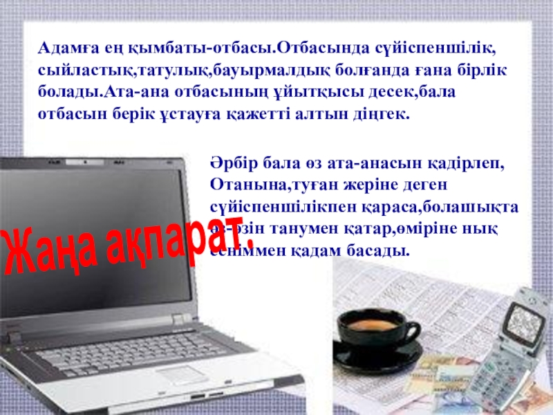 Әрбір бала өз ата-анасын қадірлеп,Отанына,туған жеріне деген сүйіспеншілікпен қараса,болашықта өз-өзін танумен қатар,өміріне нық сеніммен қадам басады.