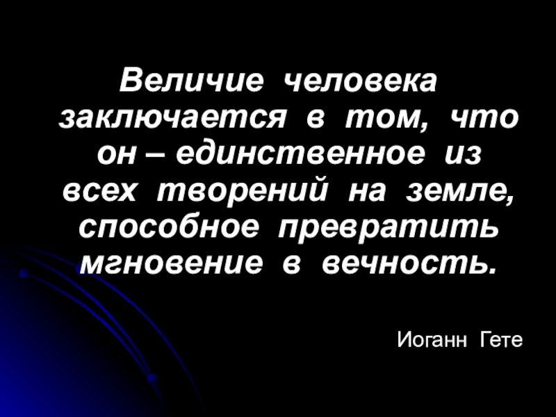 Величие человека заключается в том, что он – единственное из всех творений на земле, способное превратить мгновение в вечность.Иоганн Гете