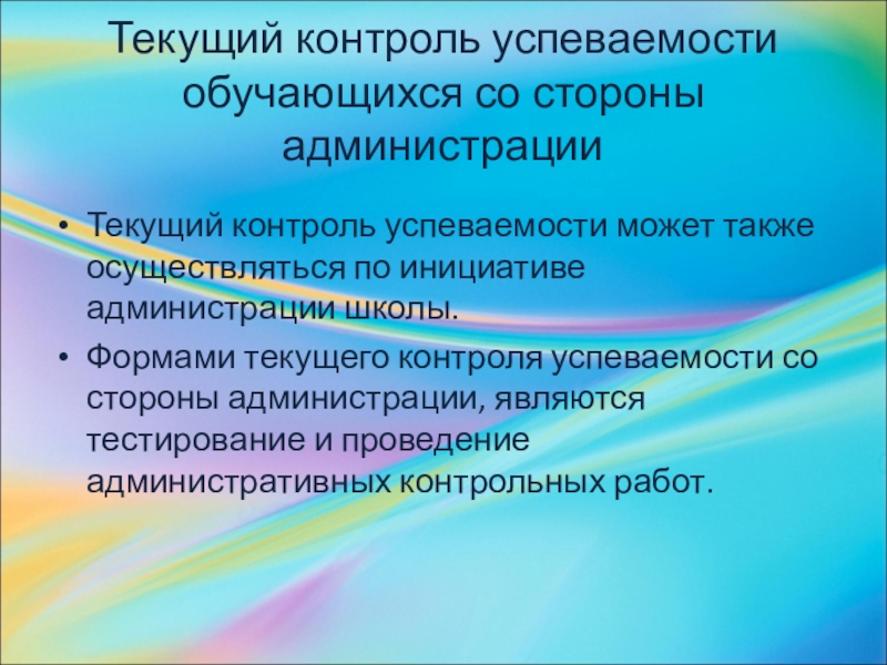 Формами текущего контроля успеваемости со стороны администрации, являются тестирование и проведение административных контрольных работ.