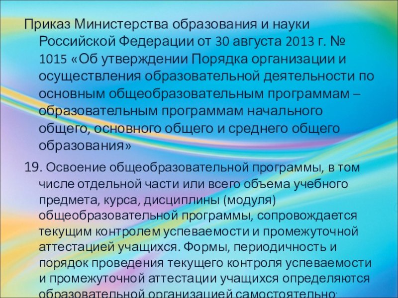19. Освоение общеобразовательной программы, в том числе отдельной части или всего объема учебного предмета, курса, дисциплины (модуля) общеобразовательной программы, сопровождается текущим контролем успеваемости и промежуточной аттестацией учащихся. Формы, периодичность и порядок проведения текущего контроля успеваемости и промежуточной аттестации учащихся определяются образовательной организацией самостоятельно.