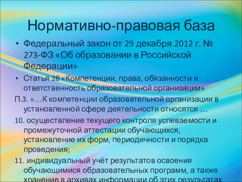 10. осуществление текущего контроля успеваемости и промежуточной аттестации обучающихся, установление их форм, периодичности и порядка проведения;
