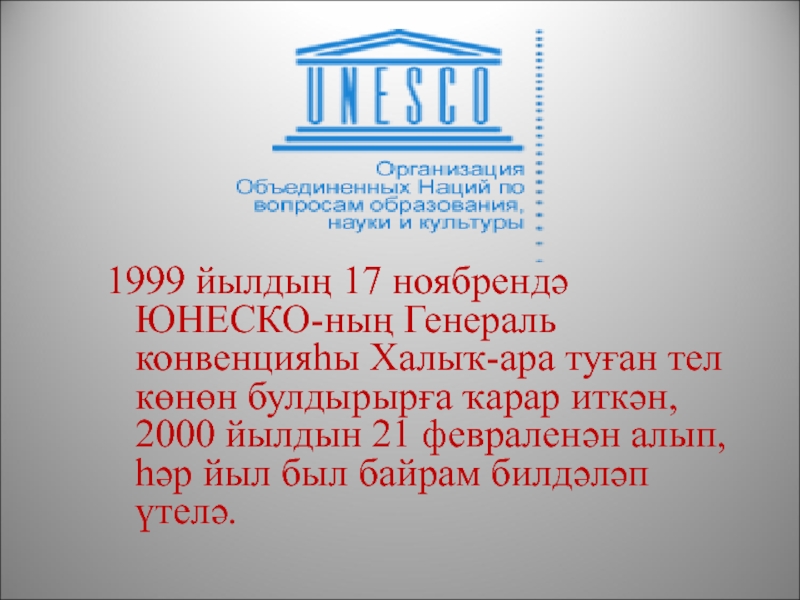 1999 йылдың 17 ноябрендә ЮНЕСКО-ның Генераль конвенцияһы Халыҡ-ара туған тел көнөн