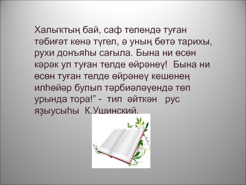 тарихы, рухи донъяһы сағыла. Бына ни өсөн кәрәк ул туған телде өйрәнеү! Бына ни өсөн туған телде өйрәнеү кешенең илһөйәр булып тәрбиәләүендә төп урында тора!” - тип әйткән рус яҙыусыһы К.Ушинский.