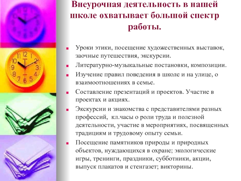 Слайд 9Внеурочная деятельность в нашей школе охватывает большой спектр работы.