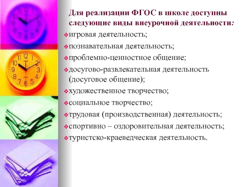 Слайд 7Для реализации ФГОС в школе доступны следующие виды внеурочной деятельности:
