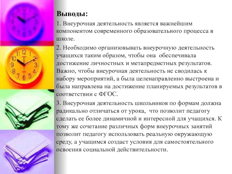3. Внеурочная деятельность школьников по формам должна радикально отличаться от урока, что позволит педагогу сделать ее более динамичной и интересной для учащихся. К тому же сочетание различных форм внеурочных занятий позволит педагогу использовать реальную окружающую среду, а учащимся создаст условия для самостоятельного освоения социальной действительности.