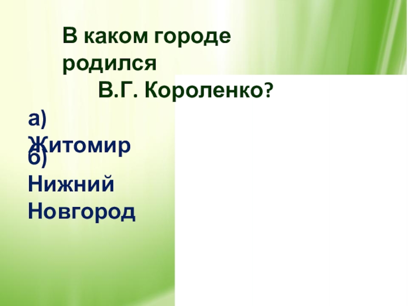 В каком городе родился В.Г. Короленко?а) Житомирб) Нижний Новгород
