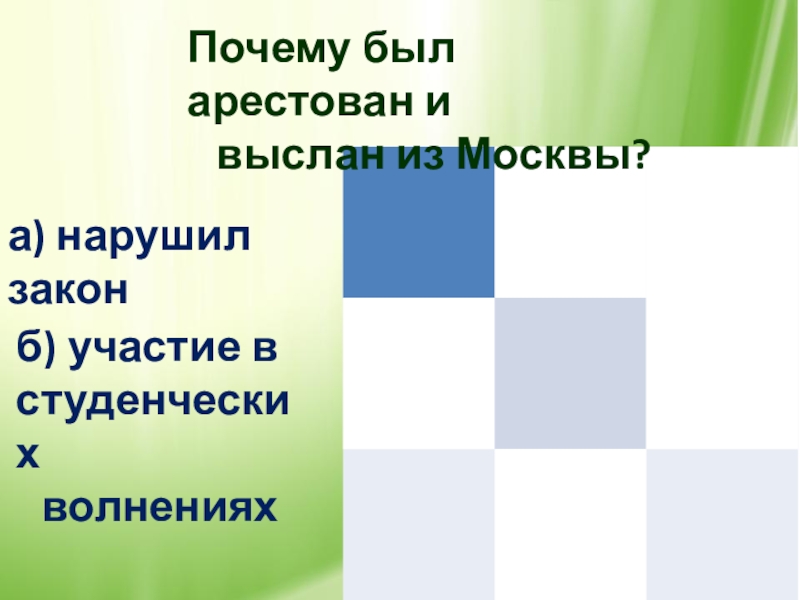 Почему был арестован и выслан из Москвы?а) нарушил законб) участие в студенческих волнениях
