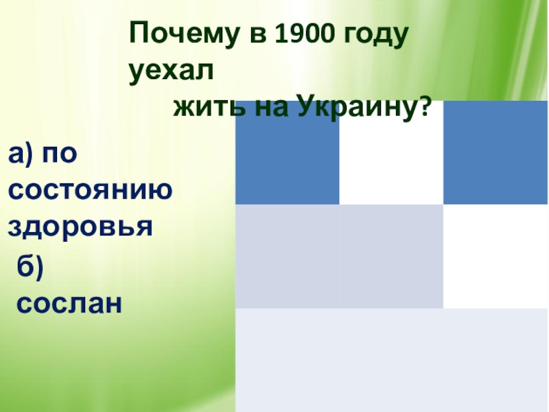 Почему в 1900 году уехал жить на Украину?а) по состоянию здоровьяб) сослан