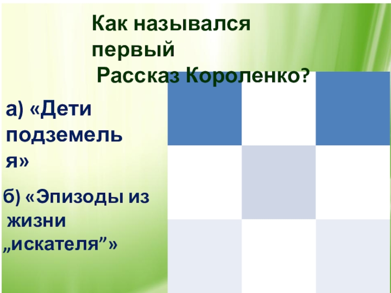 Как назывался первый Рассказ Короленко?а) «Дети подземелья»б) «Эпизоды из жизни „искателя”»