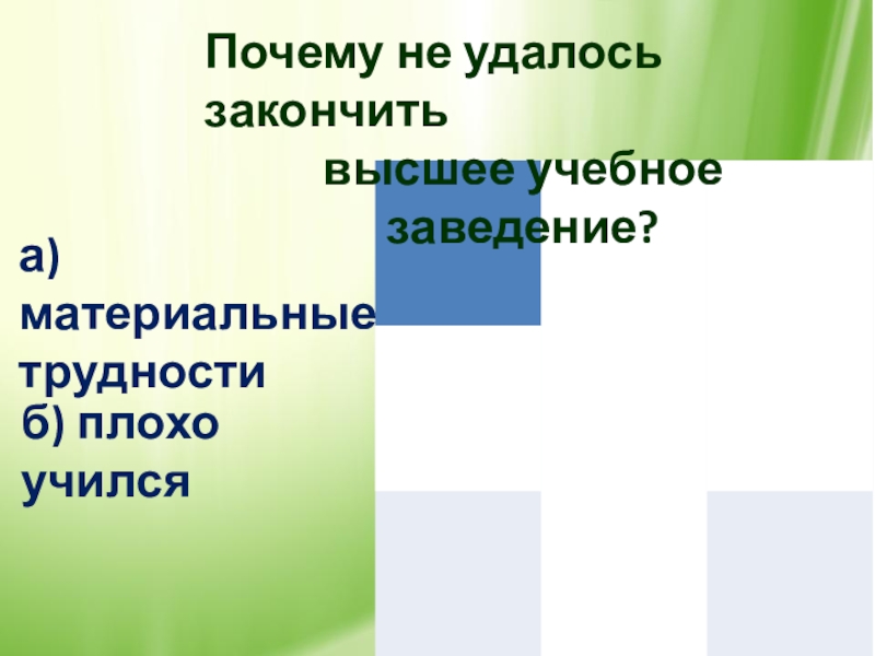 Почему не удалось закончитьвысшее учебное заведение?а) материальныетрудностиб) плохо учился