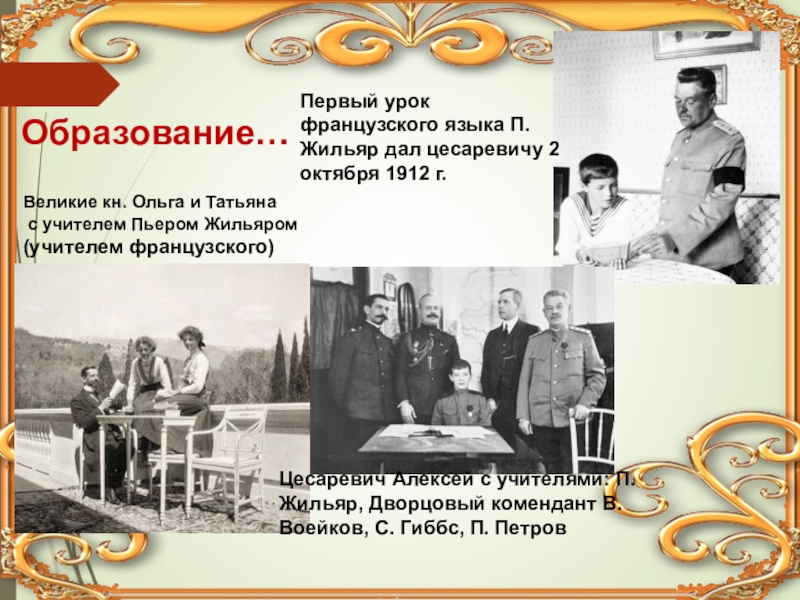 Цесаревич Алексей с учителями: П. Жильяр, Дворцовый комендант В. Воейков, С. Гиббс, П. Петров