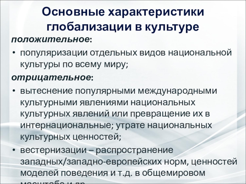 Слайд 10Основные характеристики глобализации в культуре