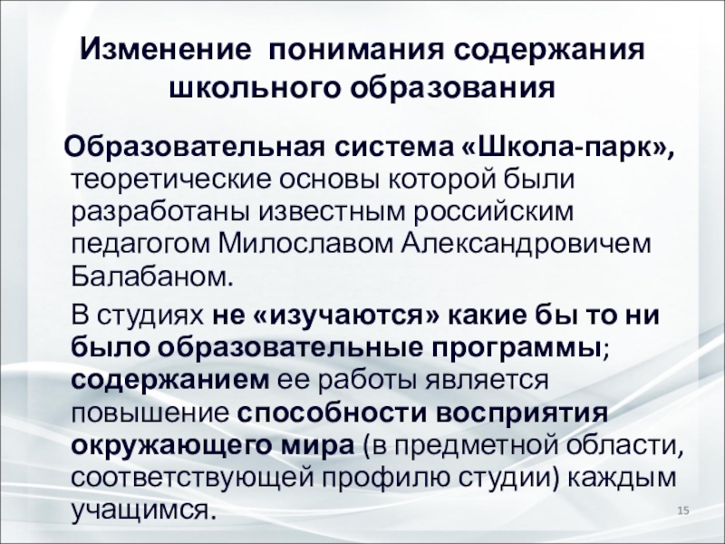 Слайд 15Изменение понимания содержания школьного образования