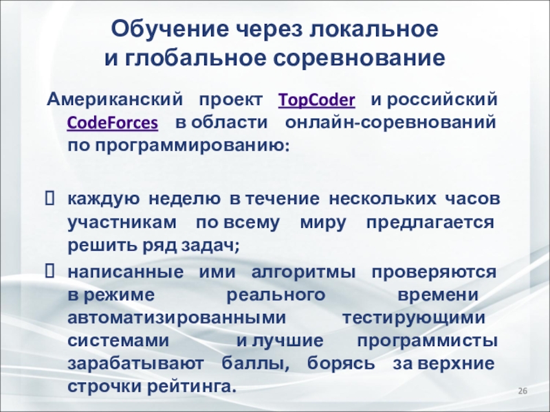 написанные ими алгоритмы проверяются в режиме реального времени автоматизированными тестирующими системами и лучшие программисты зарабатывают баллы, борясь за верхние строчки рейтинга.