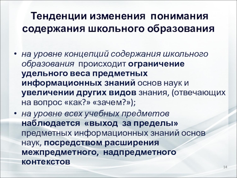 Слайд 14 Тенденции изменения понимания содержания школьного образования