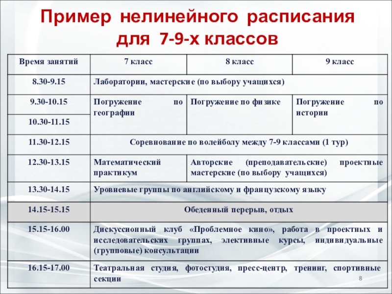 Слайд 8Пример нелинейного расписания для 7-9-х классов