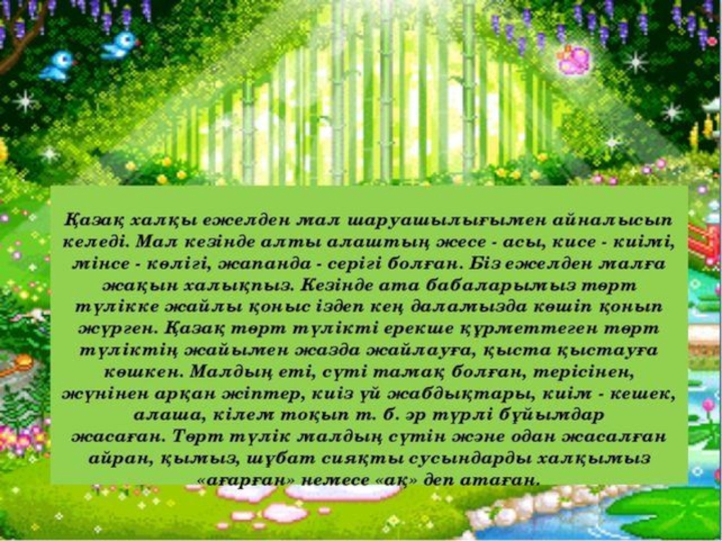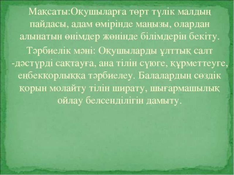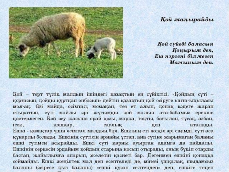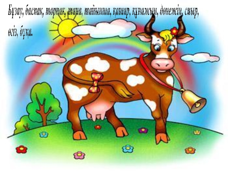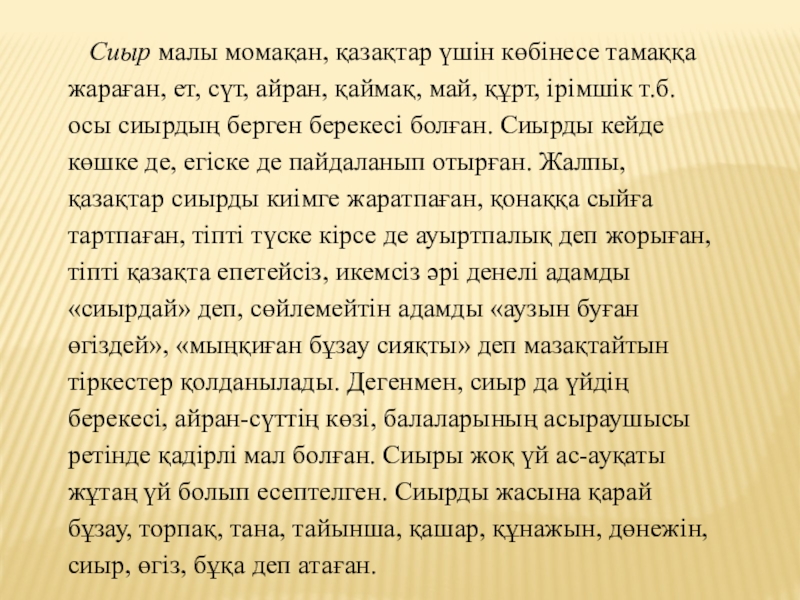 Слайд 6    Сиыр малы момақан, қазақтар үшін көбінесе тамаққа жараған, ет, сүт, айран, қаймақ,