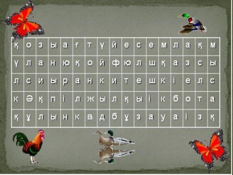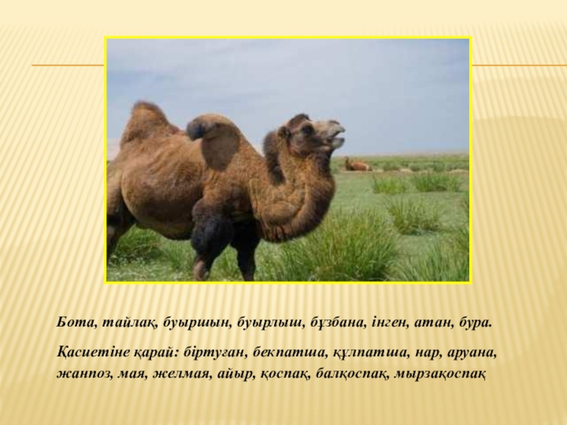 Слайд 8Бота, тайлақ, буыршын, буырлыш, бұзбана, інген, атан, бура.