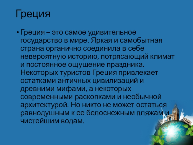 страна органично соединила в себе невероятную историю, потрясающий климат и постоянное ощущение праздника. Некоторых туристов Греция привлекает остатками античных цивилизаций и древними мифами, а некоторых современными раскопками и необычной архитектурой. Но никто не может остаться равнодушным к ее белоснежным пляжам и чистейшим водам.