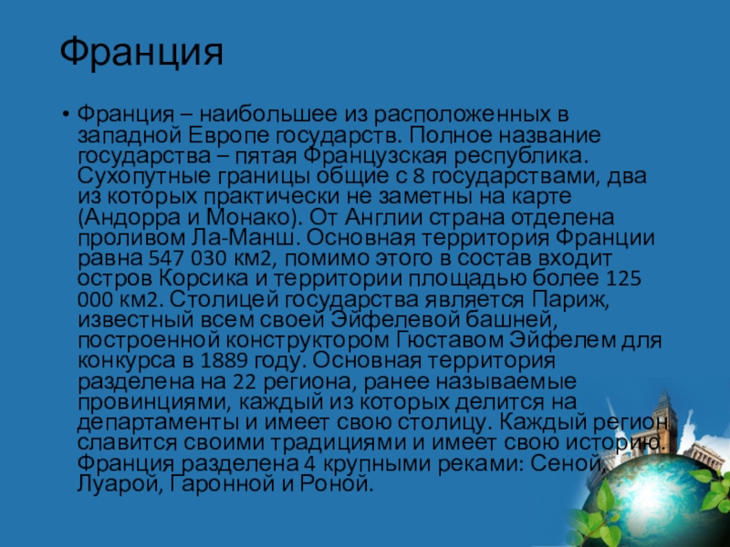 государства – пятая Французская республика. Сухопутные границы общие с 8 государствами, два из которых практически не заметны на карте (Андорра и Монако). От Англии страна отделена проливом Ла-Манш. Основная территория Франции равна 547 030 км2, помимо этого в состав входит остров Корсика и территории площадью более 125 000 км2. Столицей государства является Париж, известный всем своей Эйфелевой башней, построенной конструктором Гюставом Эйфелем для конкурса в 1889 году. Основная территория разделена на 22 региона, ранее называемые провинциями, каждый из которых делится на департаменты и имеет свою столицу. Каждый регион славится своими традициями и имеет свою историю. Франция разделена 4 крупными реками: Сеной, Луарой, Гаронной и Роной.