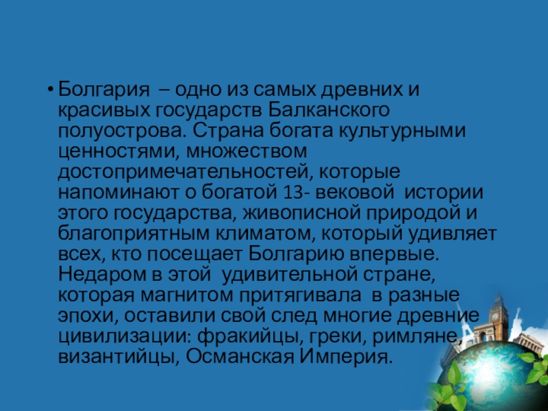 Страна богата культурными ценностями, множеством достопримечательностей, которые напоминают о богатой 13- вековой истории этого государства, живописной природой и благоприятным климатом, который удивляет всех, кто посещает Болгарию впервые. Недаром в этой удивительной стране, которая магнитом притягивала в разные эпохи, оставили свой след многие древние цивилизации: фракийцы, греки, римляне, византийцы, Османская Империя.