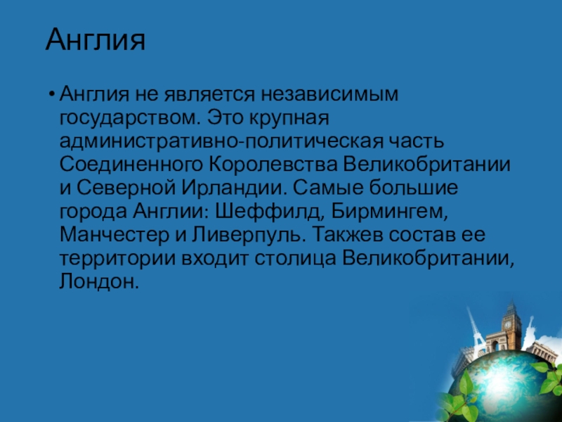 Великобритании и Северной Ирландии. Самые большие города Англии: Шеффилд, Бирмингем, Манчестер и Ливерпуль. Такжев состав ее территории входит столица Великобритании, Лондон.