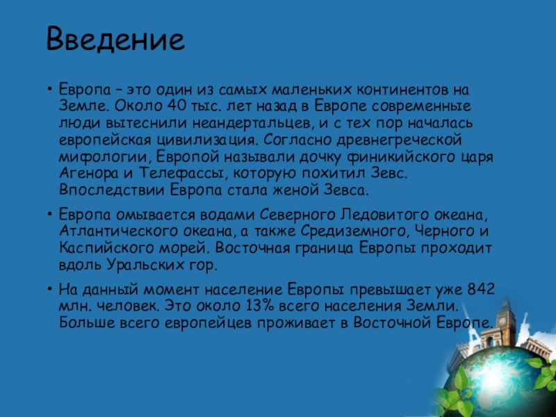 40 тыс. лет назад в Европе современные люди вытеснили неандертальцев, и с тех пор началась европейская цивилизация. Согласно древнегреческой мифологии, Европой называли дочку финикийского царя Агенора и Телефассы, которую похитил Зевс. Впоследствии Европа стала женой Зевса.