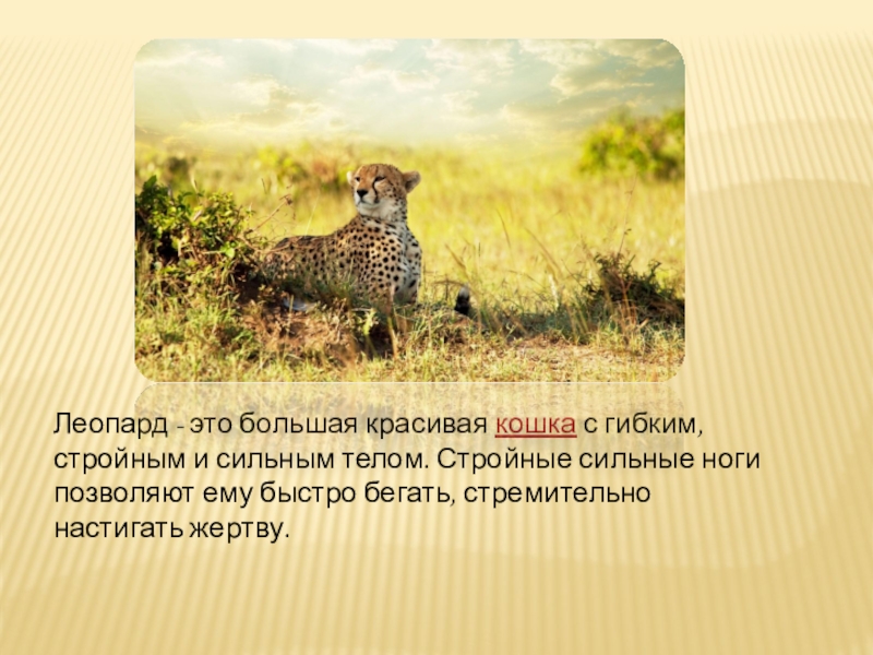 Слайд 6Леопард - это большая красивая кошка с гибким, стройным и сильным телом. Стройные
