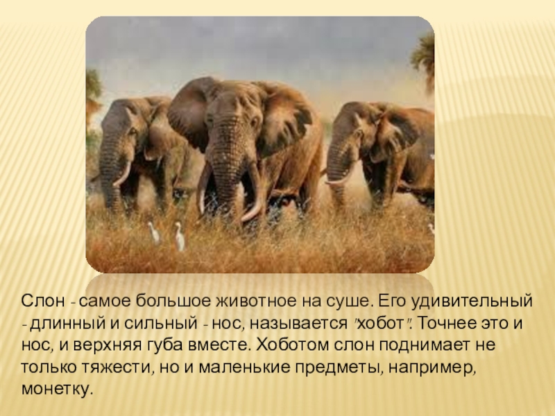 Слон - самое большое животное на суше. Его удивительный - длинный и сильный - нос, называется